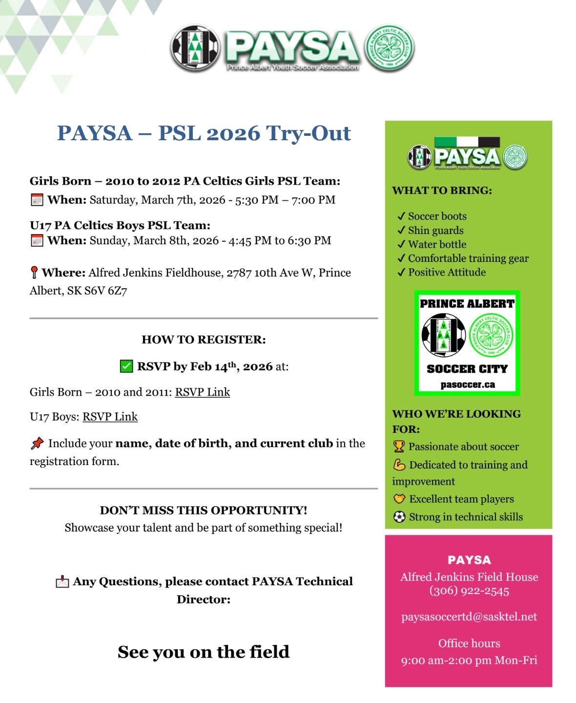 Please contact the office if:โข If your child has already played at the Celtic level, but from some reasons can not attend the tryouts (please let us know if you are still interested in participating).โข If your child has never played Celtics before and cannot attend tryouts, please let us know and they will be invited for the first Celtic practice to determine if they have enough skills to join the team.โข Please make sure you show up for your appropriate age group. As per Celtic guidebook nobody is allowed to play in older age group.If you have any other questions, please contact our Technical Director at paysasoccertd@sasktel.net